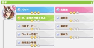 • 白因子(スキル因子): 育成時に有利なスキルを引き継ぐ因子。特に「弧線のプロフェッサー」や「スピードスター」などの強力なスキルが継承できると、育成がかなり楽になるから、狙っていこう!