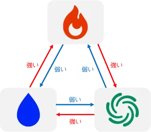 バトルでは「火・水・風」の属性がめちゃ重要!この3属性はじゃんけんみたいな関係で、火には水が強くて、水には風、風には火が強いって感じ。